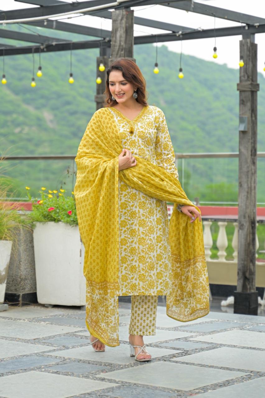 Gindly Pure Cotton Embroidered Straight Women's Ethnic Wear Kurta Pant Dupatta Set